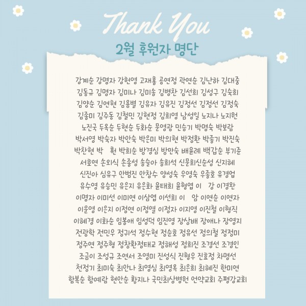 2025년도 2월 후원자 명단 페이지 정보 작성자 관리자 작성일25-03-17 11:28 조회805회 댓글0건 관련링크 이전글 다음글 목록 본문 후원에 감사드립니다. 댓글목록 등록된 댓글이 없습니다. 이전글 다음글 목록
